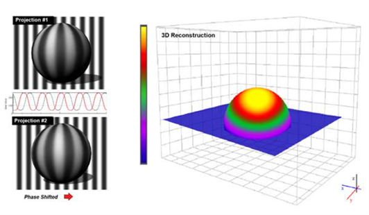 您可能會注意到,在圖5的右側僅重建了球體的前半部分(或“上半部分”)。對于這個假設的示例,我們假設沒有移動攝像機。重要的是要了解結構光成像通常不用于測量體積密度(例如醫學成像中使用的MRI或CT掃描)。它更多地是一種“表面映射”方法,因為它照亮了一個表面,并映射了該表面的形貌變化而不是物體的體積。從平面作為參考開始,此方法測量從該參考平面開始的偏轉。即使此方法只能在任何給定的2D視圖中捕獲單個平面的偏轉,也可以通過將目標旋轉360°并捕獲覆蓋其整個表面的多個表面貼圖來組裝目標整個3D表面的3D網格。