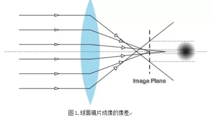 球面鏡片其鏡片呈球面的弧度,其橫切面亦呈弧狀。當不同波長的光線,以平行光軸入射后鏡片上不同的位置時,在像方焦平面上不能聚焦成一點,而形成像差的問題(如圖1)