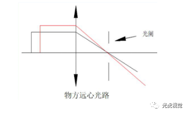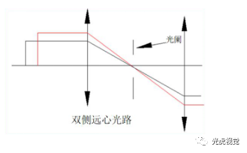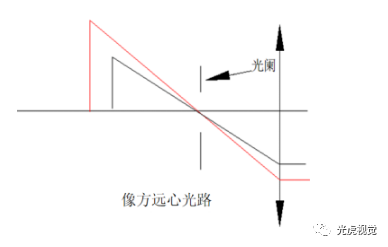像方遠心光路的光路圖如下圖 。它是將孔徑光闌放置在物方焦平面上,像方主光線平行于光軸主光線的會聚中心位于像方無窮遠。這種鏡頭的特點是放大倍率與像距無關(guān),可以消除像方調(diào)焦不準引入的測量誤差。
